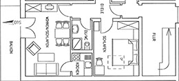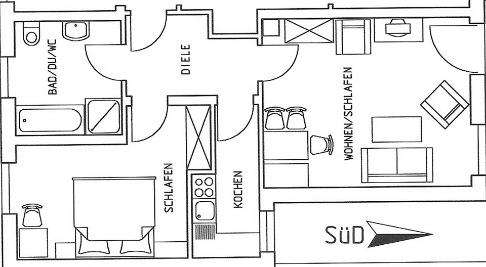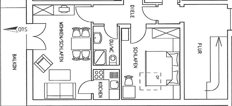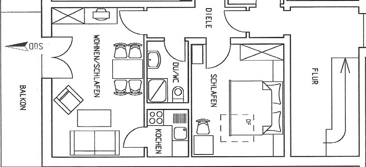 ist 42 m², liegt im 2. Stock und ist für 1-2 Personen geeignet. Schlafzimmer mit Doppelbett und Bettwäsche. Wohnküche mit Sat-TV und komplett ausgestatteter Küche. DU/WC mit Handtüchern, Balkon.
